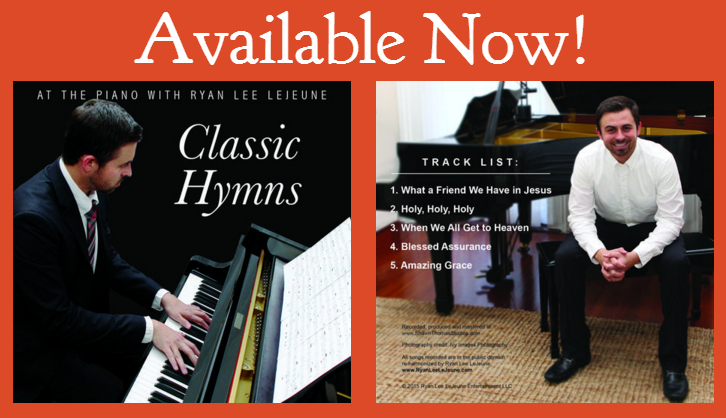The album titled “At the Piano With Ryan Lee LeJeune – Classic Hymns” is a collection of hymns, re-harmonized by Ryan himself. The album is available in cd format as well as available in over 90 digital stores worldwide.